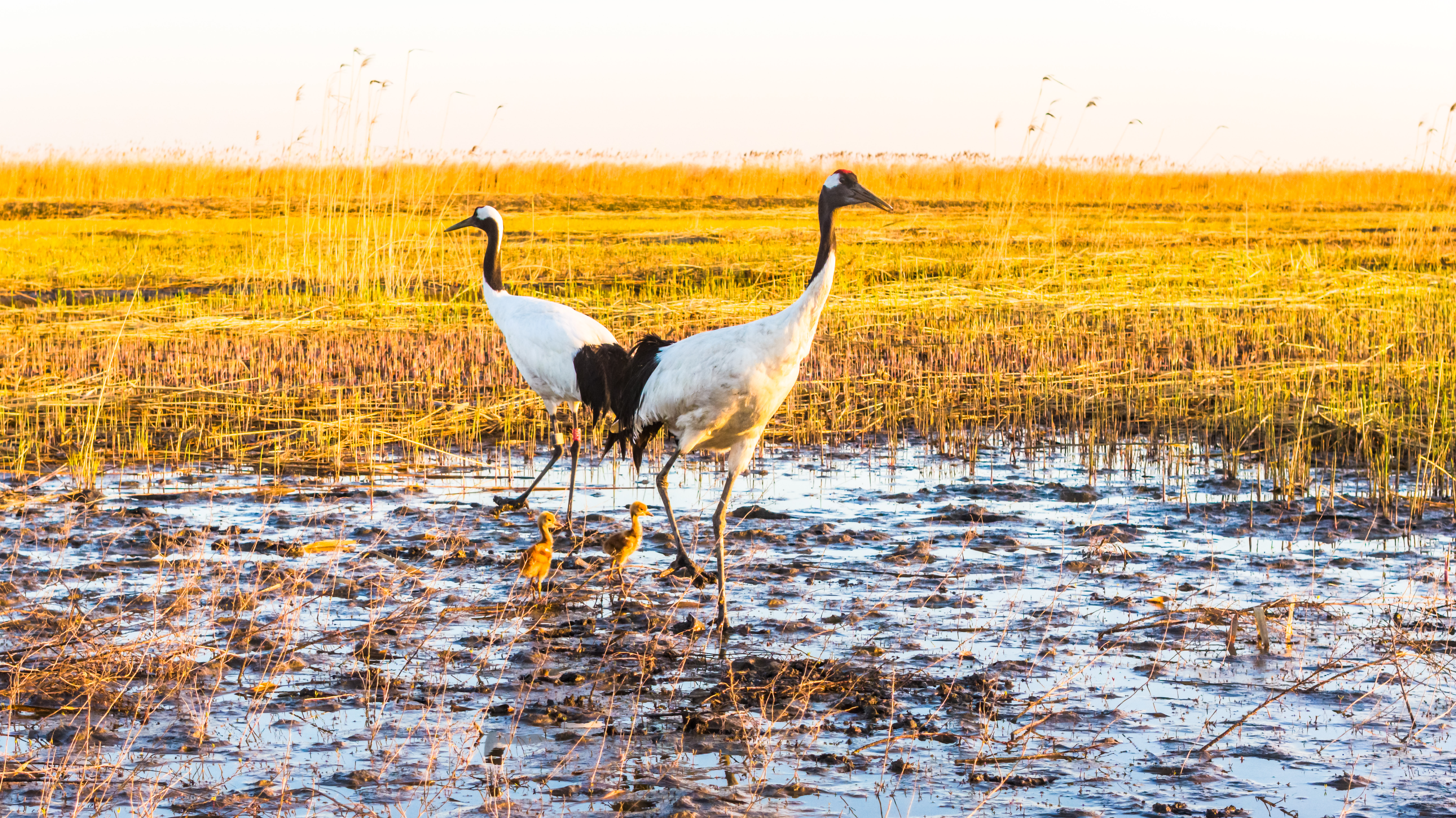这是今年盘锦市记录到的首对人工繁育野化放归丹顶鹤成功繁育的后代。镜头中,鹤爸爸不时发出低沉的鸣叫,似在提醒雏鸟注意脚下水草;鹤妈妈则将细长的喙探入浅泥,衔出小鱼喂向嗷嗷待哺的幼鸟。两只小鹤通体淡黄,头顶尚未长出标志性的丹红,却已显露出优雅的长腿与脖颈,在晨曦中宛如两团跃动的金色绒球。